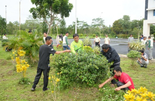 Sejak pagi hari para pegawai tampak bergotong royong memungut sampah, merapikan taman, serta membersihkan area sekitar kantor.