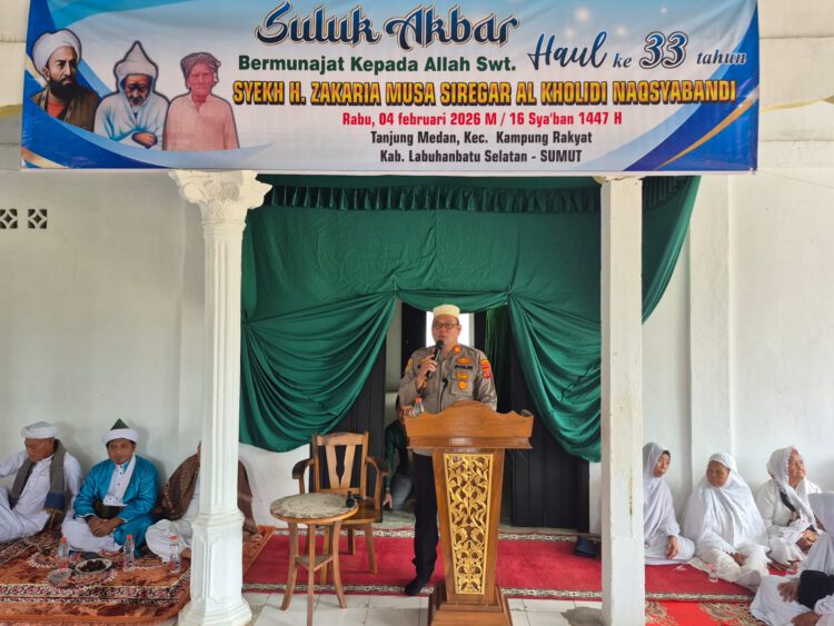 LABUHANBATU SELATAN, REDAKSI LINTAS – Polsek Kampung Rakyat jajaran Polres Labuhanbatu Selatan menghadiri kegiatan keagamaan Haul ke-33 wafatnya Syeikh H. Zakaria Musa Siregar Al Kholidi Naqsyabandi yang dilaksanakan di Persulukan Syiar Islam Dusun Labuhan, Desa Tanjung Medan, Kecamatan Kampung Rakyat, Kabupaten Labuhanbatu Selatan, Rabu (04/02/2026) pukul 10.00 WIB.