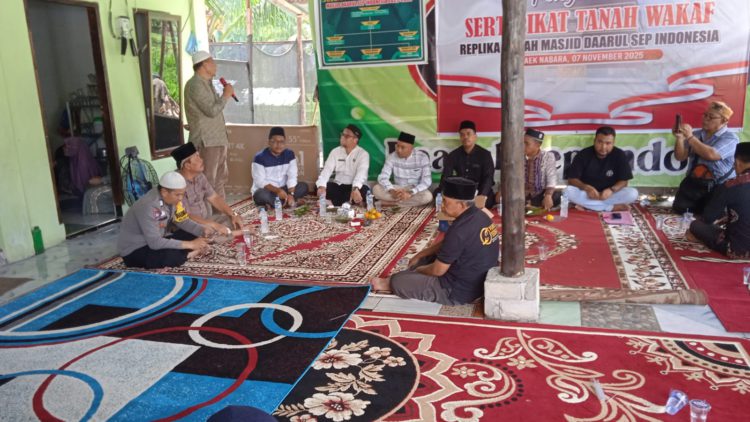 REDAKSI LINTAS, LABUHANBATU – Di Halaman Masjid Reflika Ka’bah Desa Perbaungan Kecamatan Bilah Hulu Kabupaten Labuhanbatu Provinsi Sumatra Utara, usai sholat jumat bersama para jamaah, Eko Pranata, S.H., M.Kn., CEO SEP Indonesia didampingi  ibu – ibu si sekitar Masjid dan pengurus  Badan Kenaziran Masjid (BKM), menggelar acara penyerahan Sertifikat tanah wakap Masjid Reflika Ka’bah pada BKM, Sardi Waluyo. Jumat (7/11/2025).